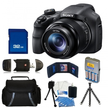 Bundle includes: 4 AA Batteries + Charger, 32GB Memory Card, High Speed Memory Card Reader, Memory Card Wallet, Flexible Gripster Tripod, and Table Top Tripod. Also features: LCD Screen Protectors, Cleaning Kit, and Carrying Case.