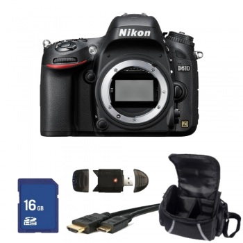 Bundle includes: Nikon D610 DSLR Camera (Body Only), 16GB Memory Card, High Speed Memory Card Reader, Mini HDMI Cable, and Carrying Case.