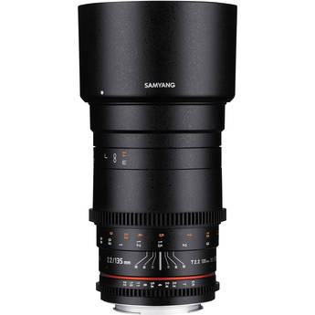 The 135mm T1.5 AS UMC VDSLR II Lens for Nikon F Mount from Samyang is a manual focus prime lens. It provides a maximum aperture of T2.2 for effective low light capture and shallow depth of field control and a 9 blade iris for attractive bokeh. Optimized for cinema and video applications, the focus and aperture control rings are outfitted with industry standard gearing, which provides an interface for working with a traditional follow focus. The aperture control ring has also been de-clicked, which enables smooth iris pulls. In addition, bright aperture and distance markings are printed on the lens barrel facing laterally to facilitate easier control by a focus puller. The lens has a minimum focus distance of 2.6'. Internal focusing minimizes the effects of focus breathing, and the lens is composed of 11 elements in 7 groups. A lens multi-coating helps to improve light transmission reducing flare and ghosting. The filter thread diameter for attaching sunshades or filter rings is 77mm.