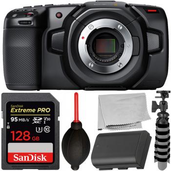 The Blackmagic Design Pocket Cinema Camera 4K features a 4/3" sensor for capturing up to 4096 x 2160 DCI 4K images at rates up to 60 fps in a variety of codecs including Blackmagic Raw at several bit rates and various ProRes 422 options. Slow-motion rates up to 120 fps are available in cropped Full HD. Its Micro Four Thirds lens mount accommodates the original, lightweight Pocket Cinema Camera lenses, and can be used with PL, C, EF, and other lenses with the use of separately available adapters. A dual-native ISO up to 25,600 is featured for low-light capture, and 13 stops of dynamic range provide rich HDR images.