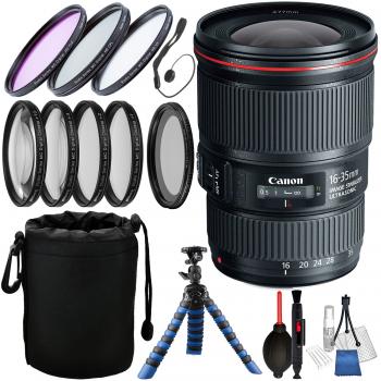 Covering a useful wide-angle focal length range, the EF 16-35mm f/4L IS USM is a Canon L-series lens distinguished by its constant f/4 maximum aperture, sophisticated optical design, and use of image stabilization to realize sharp imagery. Two ultra-low dispersion elements are used to greatly reduce color fringing and chromatic aberrations throughout the zoom range for high clarity and color accuracy, and a Super Spectra coating has also been applied to suppress flare and ghosting for improved contrast. Three aspherical elements are also featured and help to control distortion and minimize spherical aberrations for improved sharpness.