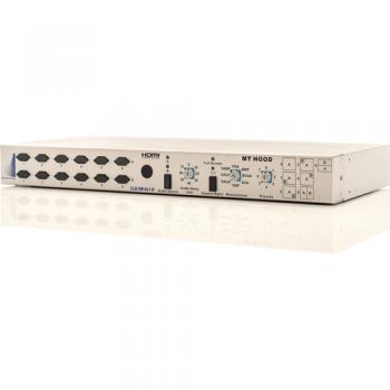 Up/down/cross converter equipped with HDMI input and output Deep color, 12-bit support HDTV resolution up to 1080p De-interlacing (interlace to progressive conversion) Compliant with the specifications of HDMI Seven built-in preset modes (one full-screen, four PiP, two PbP) Supports adjustable audio delay time for lip sync (up to 70 ms) Supports 1:1 aspect ratio mode, which keeps original input source aspect size and ratio Supports full-screen aspect ratio mode, which modifies the original input image to fit the aspect ratio of the output display Image may be cropped or distorted to fit within the screen of the output display VGA, 480p, SVGA, XGA, 720p, SXGA, UXGA, and 1080p resolutions Supports audio delay adjustment for lip sync Supports both HDMI and VGA output Supports RS-232 control Supports Ethernet control IR remote control 12 VDC power Hot-pluggable and 1 RU rack design EDID management (copy from destination port)