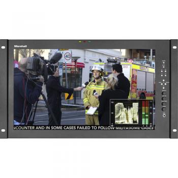 The 17.3" Rackmount Monitor from Marshall Electronics features various built-in functions such as waveform and audio bar overlays, three-color tally lights, and tilting mount design for easy viewing. It also features loud speakers and programmable function buttons. This 17.3" Rackmount Monitor outputs 400 cd/m output and supports Full HD resolution. The contrast ratio of 600:1 showcases this monitor's ability to handle images in varied light conditions. It is suitable for use in news vans, satellite trucks, and central equipment rooms.